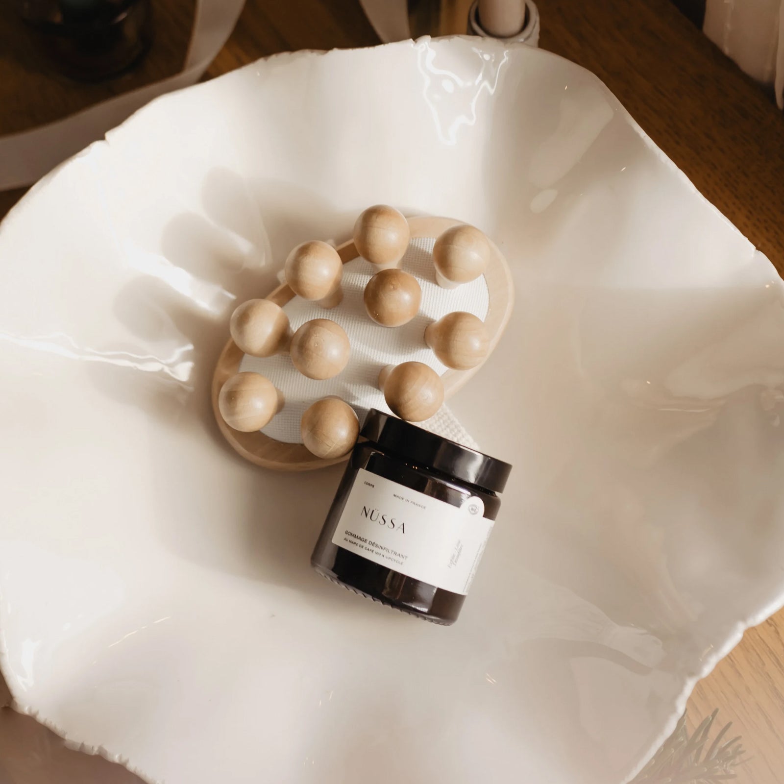 The Nüssa Anti-cellulite body brush is a massage accessory specially designed to reduce the appearance of cellulite and stimulate blood circulation. With its moving balls, this brush promotes lymphatic drainage and helps smooth skin for a firmer, more toned appearance.